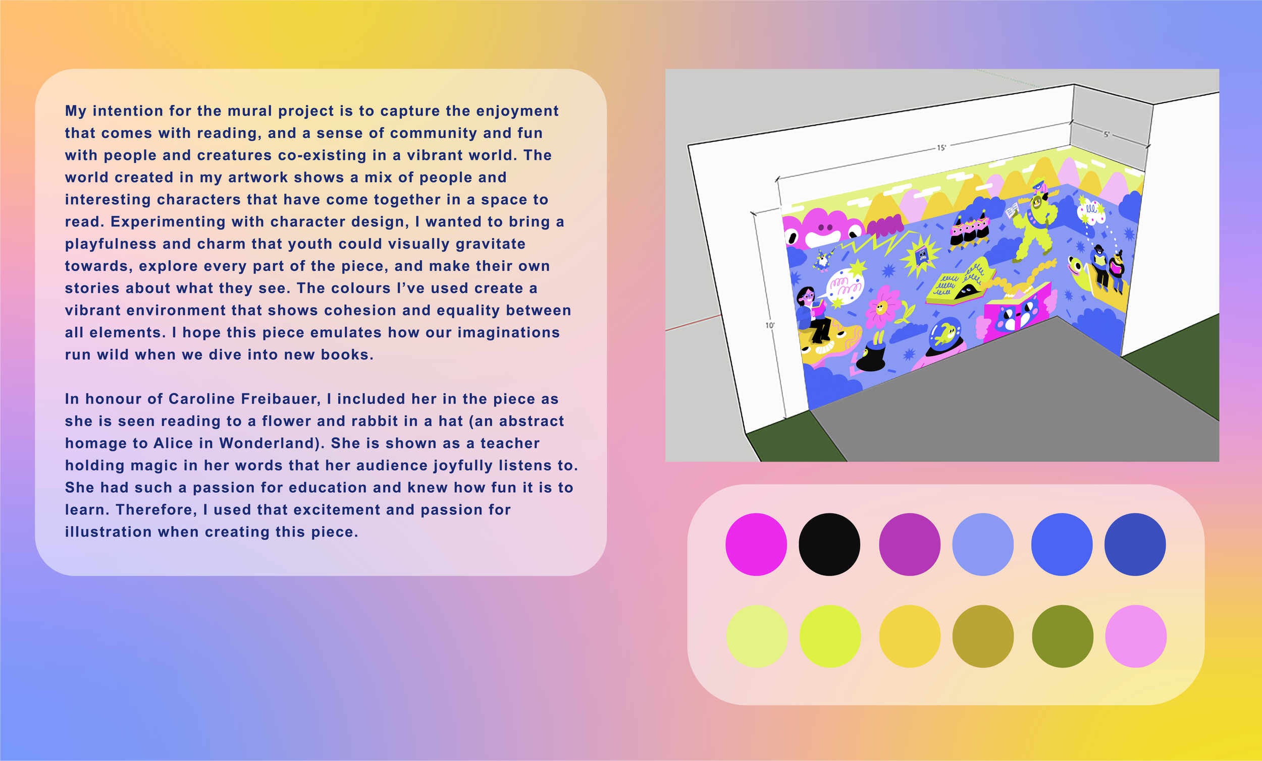 A mural submission for the Brantford Public Library’s children’s area as a tribute to the late Caroline Freibauer. Caroline was a beloved figure within Brantford as she started as a journalist at the Brantford Expositor, then a high school teacher to a teacher librarian. The mural encompassed Caroline’s advocacy for literature, and her wonderful spirit.